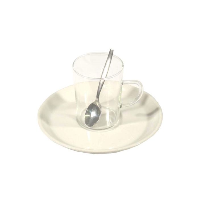 - Inhoud per set: 1 glazen kopje + 1 keramieken schotel + 1 lepeltje